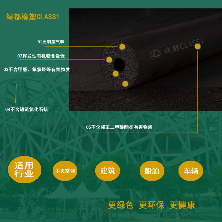 本品為閉孔彈性材料,具有柔軟、耐曲繞、耐寒、耐熱、阻燃、防水、導熱系數低、減震、吸音等優良性能。可廣泛用于中央空調、建筑、化工、醫藥、輕紡、冶金、船舶、車輛、電器等行業和部門的各類冷熱介質管道、容器,能達到降低冷損和熱損的效果。又優異它施工方便、外觀整潔美觀,沒有污染,因此是一種高品質的絕熱保溫材料。由于本材料的柔軟、耐曲繞等特點,可加工制作健身器材、醫療器械、日用品的把套、護套等。